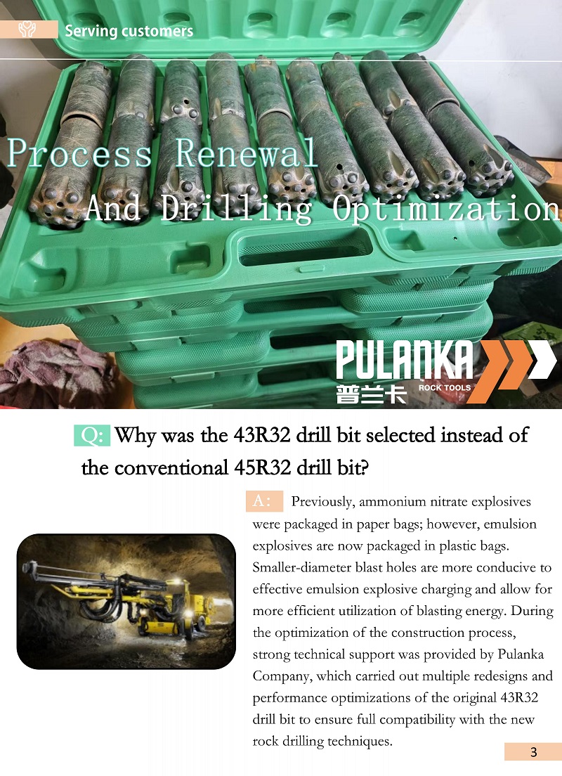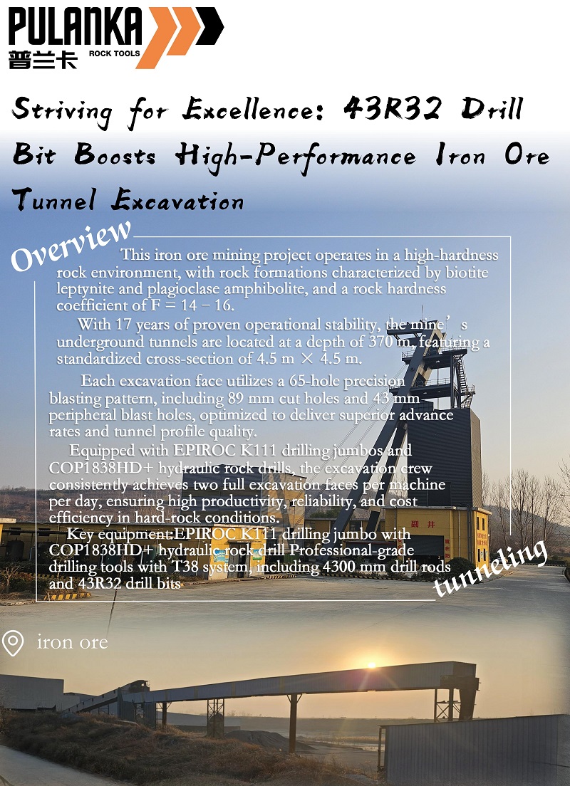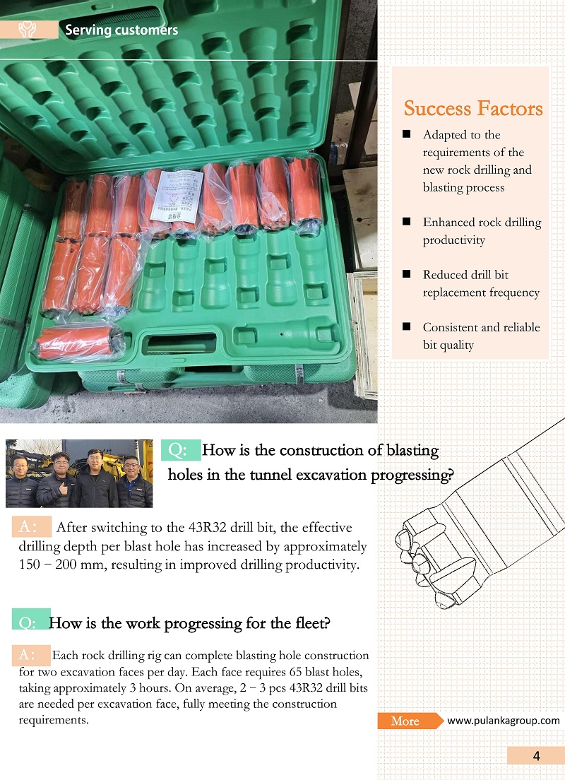 Resultados:Depois de mudar para a broca 43R32, a profundidade efetiva de perfuração por furo de detonação aumentou aproximadamente 150–200 mm, resultando em maior produtividade de perfuração. Cada equipamento de perfuração de rocha pode concluir a construção de furos de detonação para duas faces de escavação por dia. Cada face requer 65 furos de explosão, levando aproximadamente 3 horas. Em média, são necessárias 2–3 brocas 43R32 por face de escavação, atendendo totalmente aos requisitos de construção.